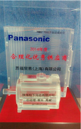 2015年3月20日,恩福貿易(上海)有限公司獲得了珠海松下馬達有限公司頒發(fā)的2014年度“合理化優(yōu)秀供應商”獎。頒獎儀式在松下的會議室舉行,恩福的市場區(qū)域經理洪道弘,銷售部副科長嚴志楹以及銷售擔當梁博出席了頒獎儀式并代表恩福領取了獎項。